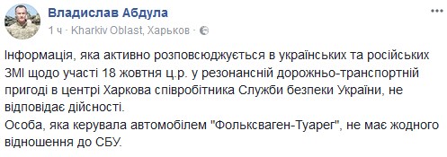 "Информация, которая активно распространяется в украинских и российских СМИ об участии 18 октября в резонансном дорожно-транспортном происшествии в центре Харькова сотрудника Службы безопасности Украины, не соответствует действительности. Лицо, управлявшее автомобилем Volkswagen Touareg, не имеет никакого отношение к СБУ", - подчеркнул Абдула.