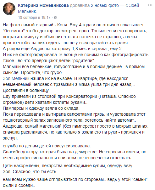 "Троих детей, которых изъяли из притона (по-другому не знаю как назвать жилище, где постоянно пили, курили, вскрывали себе вены и морили голодом детей, где не было ни единой игрушки, а из еды - скисшие макароны) теперь кормят волонтеры по очереди", - написала Мельник.
