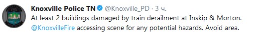 В американском городе Ноксвилл Штата Теннесси поезд сошел с рельсов и врезался в здание. Об этом сообщила пресс-служба полиции города на своей странице в Twitter.
