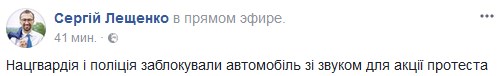На видео, которое опубликовал Лещенко видно, что протестующие пытались прорвать заграждение силовиков, чтобы разблокировать автомобиль. После неудачной попытки прорыва, митингующие потребовали от руководства полиции и Нацгвардии пропустить автомобиль для проведения акции протеста.