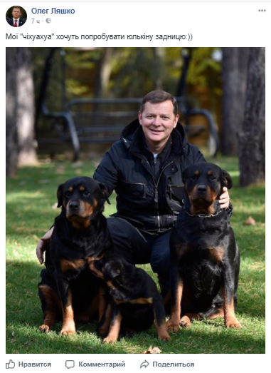 "Мои "чихуахуа" хотят попробовать юлькину задницу:))", - так политик подписал фото со своими ротвейлерами 22 октября.