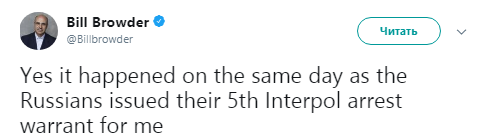 "Да, это случилось в тот самый день, когда русские выпустили пятый ордер Интерполу на мой арест", - написал Браудер в Twitter.