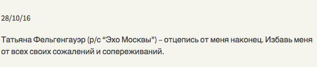 В дневнике есть пост за 14 сентября 2017 года, в котором автор пишет что от Фельгенгауэр его "уже тошнит".