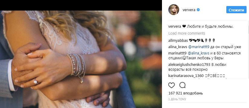 Вера выложила совместное фото с Константином в Instagram. Фото было сделано во время свадьбы Брежневой и Меладзе в Италии. Знаменитости изображены в свадебных нарядах.