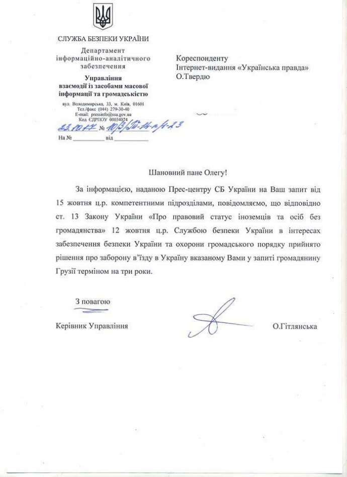 Как следует из ответа ведомства, Служба безопасности 12 октября 2017 года приняла решение о запрете въезда на три года гражданину Кобе Накопии, исходя из "интересов обеспечения безопасности Украины и охраны общественного порядка".