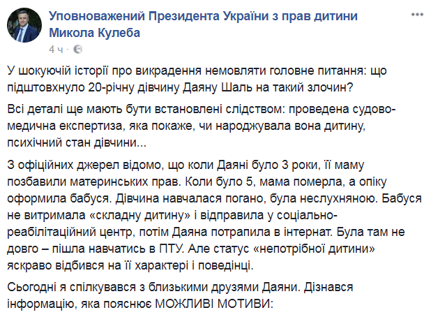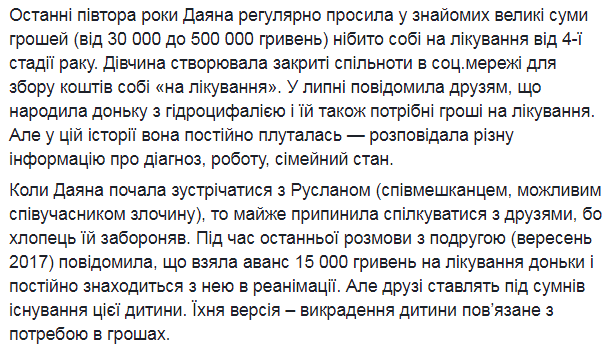 "Последние полтора года Даяна регулярно просила у знакомых крупные суммы денег (от 30 000 до 500 000 гривен) якобы себе на лечение от 4-х стадии рака. Девушка создавала закрытые сообщества в соц.сети для сбора средств себе «на лечение». В июле сообщила друзьям, что родила дочь с гидроцифалиею и ей также нужны деньги на лечение. Но в этой истории она постоянно путалась - рассказывала различную информацию о диагнозе, работу, семейное положение... Во время последнего разговора с подругой (сентябрь 2017) она сообщила, что взяла в долг 15 000 гривен на лечение дочери и постоянно находится с ней в реанимации. Но друзья сомневались в существовании этого ребенка. Их версия - похищение ребенка связано с потребностью в деньгах", - написал на Facebook-странице Уполномоченный Президента Украины по правам ребенка Николай Кулеба.