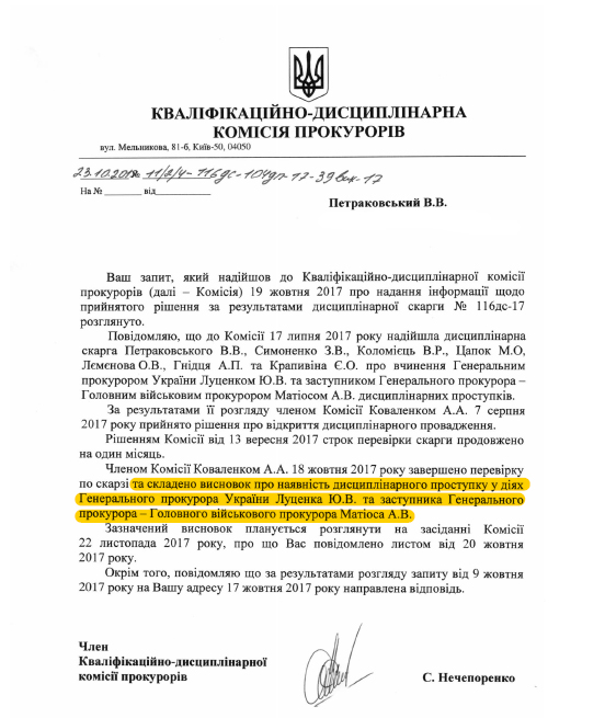 "Членом Комиссии Коваленко А.А. 18 октября 2017 года завершена проверка по жалобе и составлено заключение о наличии дисциплинарного проступка в действиях генерального прокурора Украины Луценко Ю.В. и заместителя генерального прокурора - главного военного прокурора Матиоса А.В.