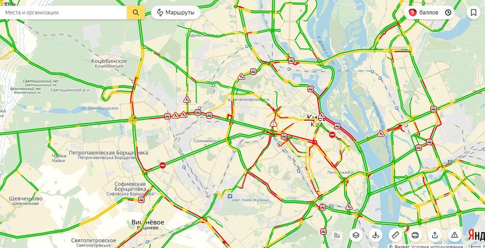 Сегодня, 24 октября, к 19-00 пробки в Киеве достигли 9 баллов из 10 возможных. Об этом сообщает сервис "Яндекс.Пробки".