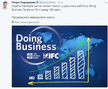 "Украина поднялась еще на четыре позиции в ежегодном рейтинге Doing Business. Теперь мы семьдесят шестом среди 190 стран", - написал президент.