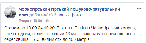 Так, на горе Поп Иван Черногорский уже лежит снег, облачно и ветрено, температура воздуха – 5°С, видимость до 100 метров.