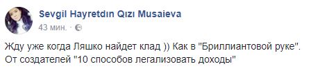 "Жду уже когда Ляшко найдет клад. Как в "Бриллиантовой руке". От создателей "10 способов легализовать доходы"", - пишет главный редактор "Украинской правды" Сегвиль Мусаева.