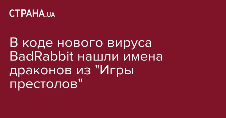 "В коде" BadRabbit "были обнаружены отсылки к фэнтезийного телесериала" Игра престолов ". Например, запланированные задачи имеют имена трех драконов из сериала: Drogon, Rhaegal, Viserion. Ранее подобные послания к популярной фэнтезийной саги были замечены мировыми экспертами в составе одного из скриптов, который использовался для распространения известного шифровальщика "Locky", - сообщает киберполиция.