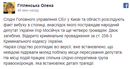 Об этом сообщила пресс-секретарь СБУ Елена Гитлянская в Facebook. По ее словам, пострадал нардеп Игорь Мосийчук и еще четыре человека. Среди них - двое погибших.