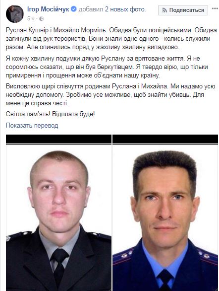 Выражаю искренние соболезнования семьям Руслана и Михаила. Мы окажем всю необходимую помощь. Сделаем все возможное, чтобы найти убийц. Для меня это дело чести. Светлая память! Расплата будет!", - резюмировал Мосийчук.