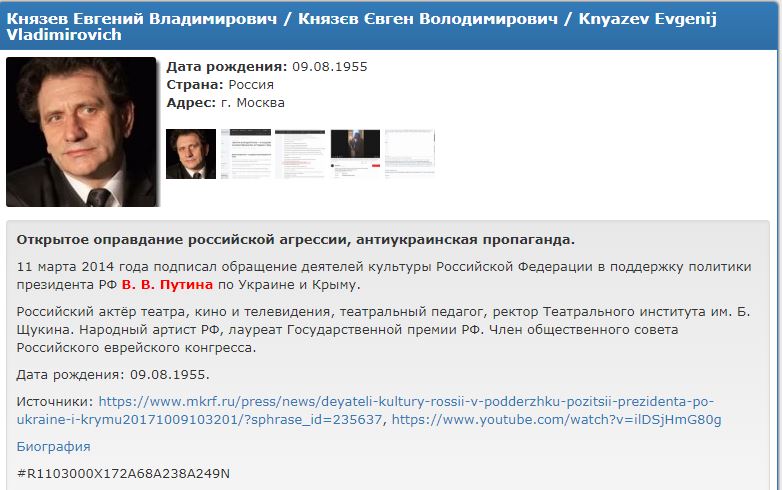 Известный российский актер театра и кино, народный артист РФ Евгений Князев попал в базу центра "Миротворец". Об этом свидетельствует соответствующая запись в чистилище "Миротворца".