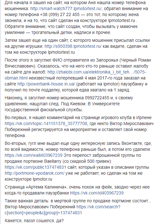 "Мою жену обманули при покупке детских смартчасов. Сама схема, о которой я напишу ниже, ничем не примечательна. Гораздо интереснее личность пока еще беспечного мошенника, который уже в самое ближайшее время сможет пополнить доблестные ряды украинских налоговиков и стать уже не только моей, но и государственной проблемой", - пишет Багинский.