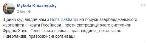 "Только что суд отдал нам с Boris Zakharov на поруки азербайджанского журналиста Фикрата Гусейнова, против экстрадиции которого выступили Фридом Хаус, Хельсинский союз по правам человека, посольство Нидерландов, правозащитные организации", – отметил он.
