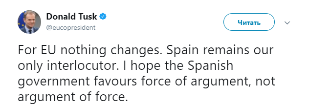17.55 "Для ЕС ничего не меняется, Испания остается нашим единственным собеседником. Я надеюсь, что испанское правительство предпочитает силу убеждения, а не аргумент силы", написал у себя в Твиттер глава Европейского Совета Дональд Туск.