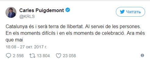 "Каталония есть и будет территорией свободы. На службе у народа. В тяжелые времена и в моменты празднований. Теперь более, чем когда-либо", — написал он в своем Twitter.