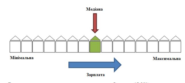 Медианная зарплата - такая, которую получает работник, находящийся в середине ряда зарплат. То есть, 50% населения получает меньше этой цифры и 50% - больше.