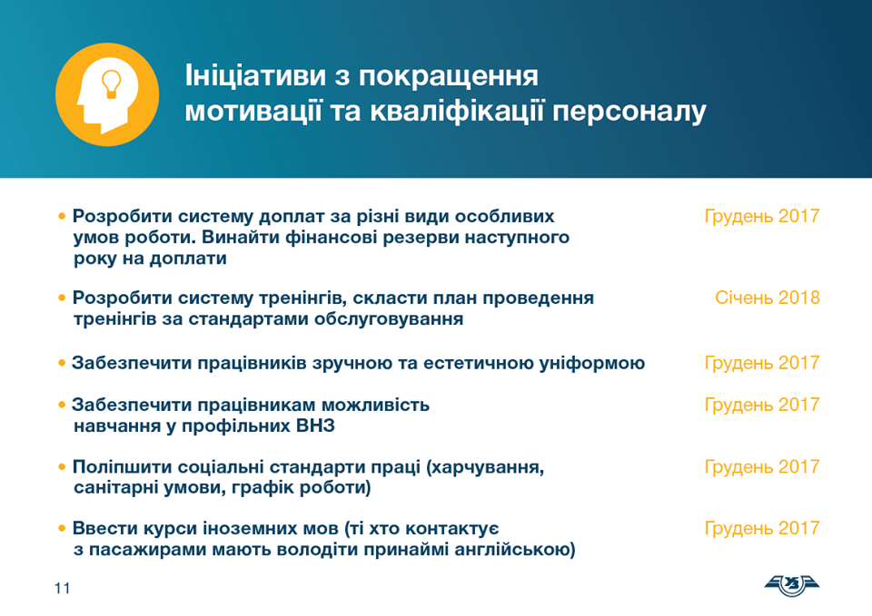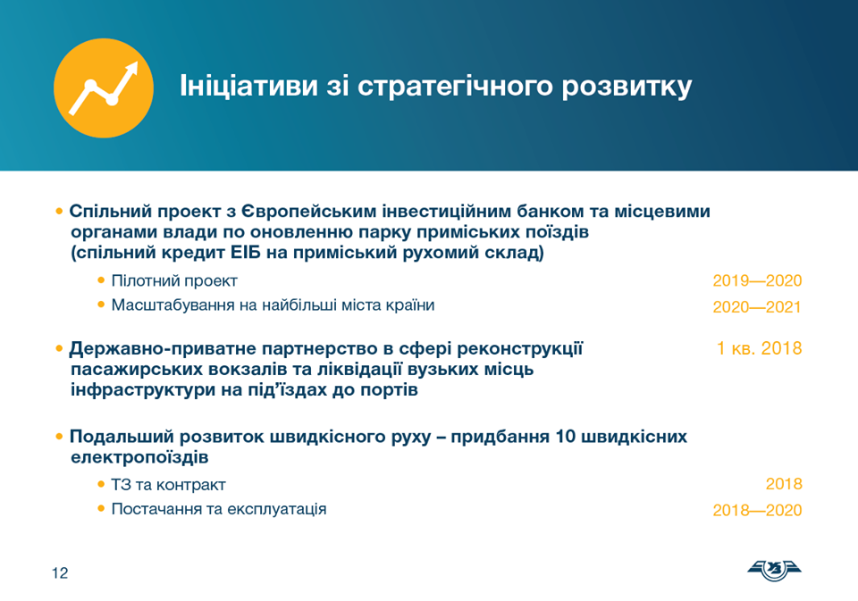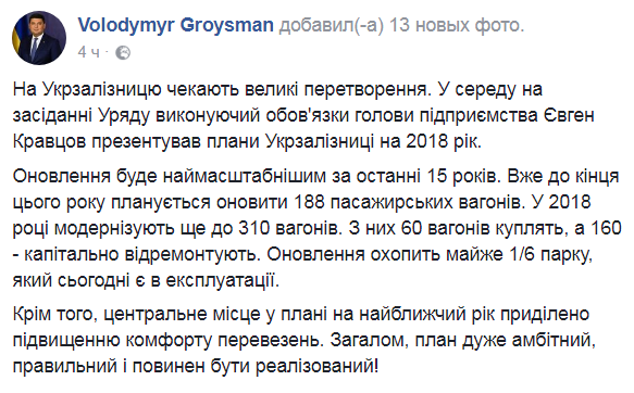 По данным интернет-ресурса "ЦТС", еще в бытность главой наблюдательного совета ПАО УЗ, в начале текущего года, нынешний ее руководитель Евгений Кравцов заявил, что "Укрзализныця" планирует с 2018 года закладывать в финансовый план средства для проведения модернизации инфраструктуры с целью увеличения скорости движения поездов, в частности скоростных. Тогда он отметил, что с 2018 года по наиболее популярным маршрутам будут проводиться комплексные мероприятия по модернизации инфраструктуры для поднятия скорости поездов до 180-200 км/час.