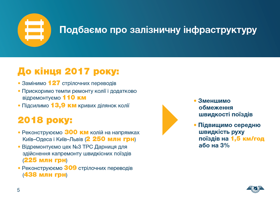 В планах на 2018 год - реконструкция 300 км путей на направлениях Киев-Одесса и Киев-Львов. Также должны быть обновлены 309 стрелочных переводов.
