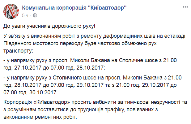 В связи с выполнением ремонта деформационных швов на эстакаде Южного мостового перехода будет частично ограничено движение транспорта с ул. Николая Бажана на Столичное шоссе с 21:00 пятницы, 27 октября до 7:00 субботы, 28 октября, а также со Столичного шоссе на ул. Николая Бажана с 21:00 субботы, 28 октября до 7:00 воскресенья, 29 октября и с 21:00 воскресенья, 29 октября по 7:00 понедельника, 30 октября, передают на Facebook-странице коммунальной корпорации "Киевавтодор".