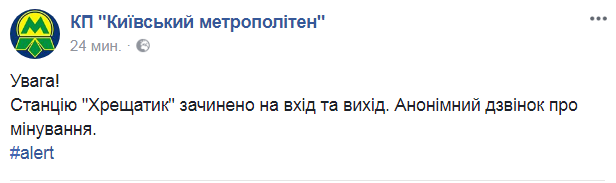 Около 21:45 пятницы, 27 октября 2017 станцию киевского метро "Хрещатик" закрыли на вход и выход. Поступил анонимный звонок про минирование, передает на Facebook-странице пресс-служба КП "Киевский метрополитен".