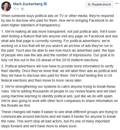"Политические рекламодатели должны будут предоставить больше сведений для их идентификации. Как только они это сделают, мы будем обозначать их рекламу как политическую, и они будут обязаны раскрыть, кто заплатил за нее", – рассказал он.