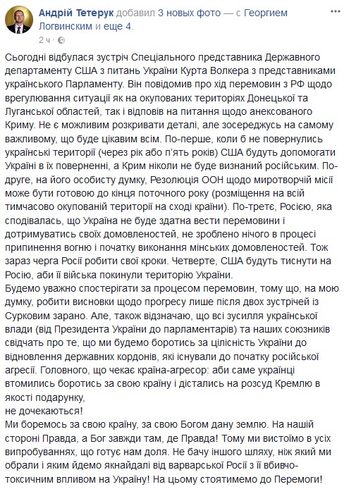 "По его Волкера личному мнению, Резолюция ООН по миротворческой миссии может быть готова к концу текущего года (размещение на всей временно оккупированной территории на востоке страны)", - привел Тетерук слова спецпредставителя Госдепа США.