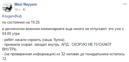 Брат нардепа Мустафы Найема написал, что по состоянию на 19:25 вчера в Деснянском военном коммисариате никого не отпускали с 04:00 утра.