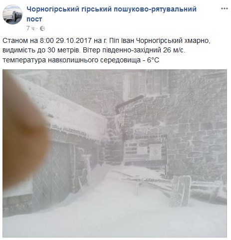 "По состоянию на 08:00 29 октября на горе Поп Иван Черногорский облачно, видимость до 30 метров. Ветер юго-западный до 26 м/с. Температура окружающей среды минус 6 градусов", - отмечается в сообщении отряда.