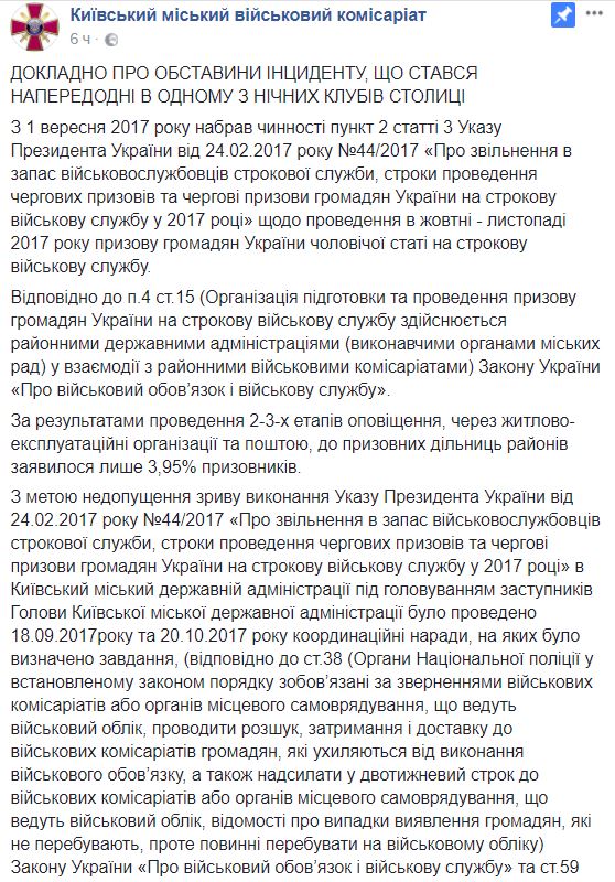 "В 02:00 часов 28.10.2017 года представителями Шевченковского районного военного комиссариата во взаимодействии с органами Национальной полиции Украины было организовано и проведено мероприятия по розыску призывников, уклоняющихся от призыва на срочную военную службу (в одном из ночных клубов столицы) По результатам проведения мероприятия в 04:00 часов 28.10.2017 года на сборный пункт Киевского городского военного комиссариата было доставлено 32 призывника для уточнения учетных данных и установления факта уклонения от призыва на срочную военную службу. По результатам проверки указанных лиц, в отношении уклонения от призыва на территории Киевского городского сборного пункта Киевского городского военного комиссариата остались 15 призывников, которые уклонялись от призыва на срочную военную службу и не являлись в военные комиссариаты", - говорится в сообщении.