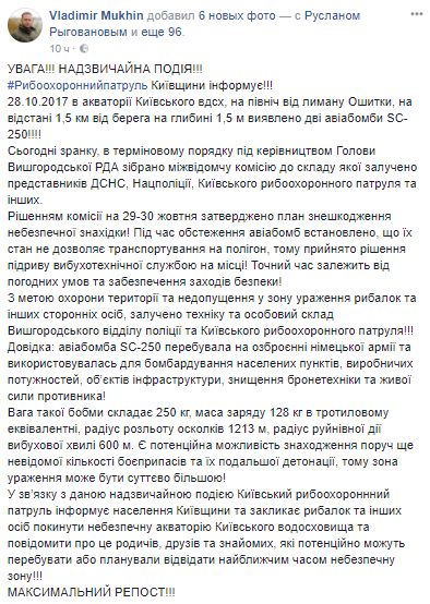 К северу от лимана Ошитки в Киевском водохранилище на расстоянии 1,5 км от берега и на глубине 1,5 метров обнаружены две авиационные бомбы SC-250. Об этом сообщил начальник Киевского рыбоохранного патруля Владимир Мухин на своей странице в Facebook.
