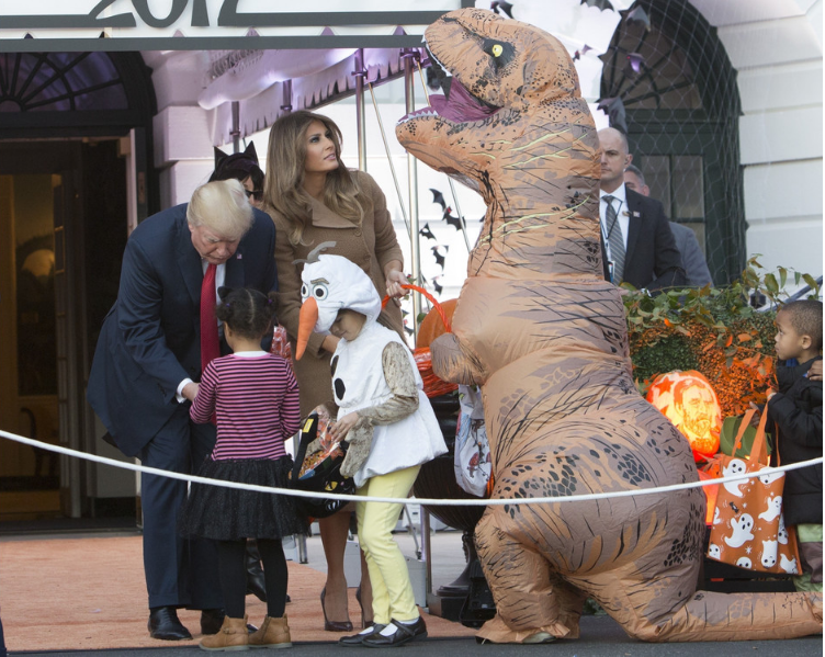 Сам президент и первая леди обошлись без карнавальных костюмов, но с удовольствием фотографировались с детьми. Особенно Меланию Трамп поразил костюм гигантского динозавра, в котором пришел один из детей.