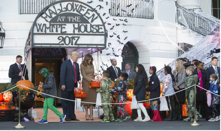 Дональд Трамп с супругой Меланией продолжили многолетнюю традицию празднования Хэллоуина в Белом доме. На лужайке у резиденции в Вашингтоне они раздали подарки детям, которые пришли в костюмах скелетов, полицейских, персонажей "Звездных войн" и динозавров.