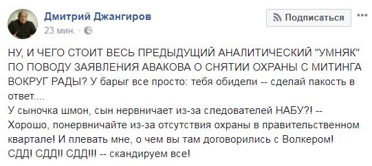"Ну, и чего стоит весь предыдущий аналитический "умняк" по поводу заяаления Авакова о снятии охраны с митинга вокруг Рады? У барыг все просто: тебя обидели -- сделай пакость в ответ...У сыночка шмон, сын нервничает из-за следователей НАБУ?! -- Хорошо, понервничайте из-за отсутствия охраны в правительственном квартале! И плевать мне, о чем вы там договорились с Волкером!", - пишет политолог Дмитрий Джангиров в Facebook.
