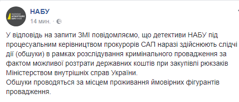 "В ответ на запросы СМИ сообщаем, что детективы НАБУ под процессуальным руководством прокуроров САП сейчас осуществляют следственные действия (обыски) в рамках расследования уголовного производства по факту возможной растраты государственных средств при закупке .