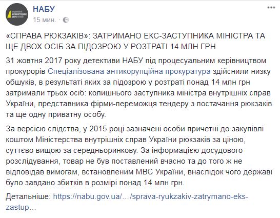 После обысков по "делу о рюкзаках", в котором замешан сын главы МВД, детективами Национального антикоррупционного бюро по подозрению в растрате более 14 млн грн задержали трех человек: бывшего заместителя министра внутренних дел Украины, представителя фирмы-победителя тендера по поставке рюкзаков и еще одно частное лицо.
