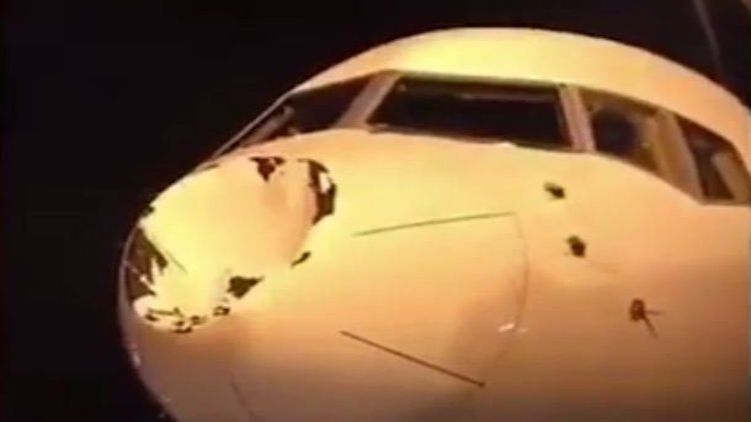 На опубликованном видео запечатлены последствия жесткой посадки лайнера компании Delta. К моменту публикации точная причина появления вмятины в носу не официально сообщается.
