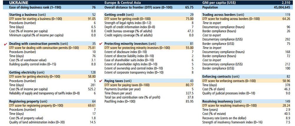 В ежегодном рейтинге Doing Business – 2018 (составляется группой Всемирного банка) Украина поднялась на 4 позиции среди 190 стран и заняла 76 место.