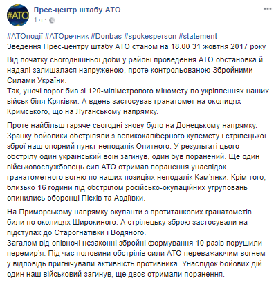 Сегодня, 31 октября, в результате обстрелов позиций украинских военных один человек погиб, еще двое получили ранения. Об этом сообщает пресс-служба штаба АТО в Facebook.