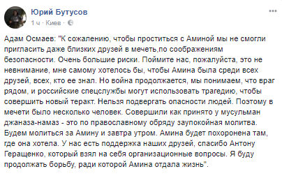 "К сожалению, чтобы проститься с Аминой мы не смогли пригласить даже близких друзей в мечеть, по соображениям безопасности. Очень большие риски. Поймите нас, пожалуйста, это не невнимание, мне самому хотелось бы, чтобы Амина была среди всех друзей, всех, кто ее знал. Но война продолжается, мы понимаем, что враг рядом, и российские спецслужбы могут использовать трагедию, чтобы совершить новый теракт. Нельзя подвергать опасности людей. Поэтому в мечети было несколько человек", - пояснил он.