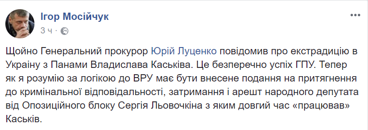 А вот нардеп-радикал Игорь Мосийчук назвал задержание Каськива успехом Генпрокуратуры и потребовал ареста нардепа от Оппоблока Сергея Левочкина, на которого, по его словам, работал Каськив.