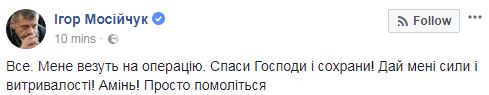 "Все. Меня везут на операцию. Спаси Господи и сохрани! Дай мне силы и выносливости! Аминь! просто помолитесь", - написал нардеп.
