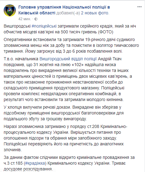 В Вышгороде молодой парень за ночь ограбил две кофейни на почти полмиллиона гривен. Об этом сообщает пресс-служба полиции Киевской области в Facebook.
