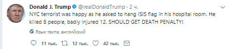 "Нью-йоркский террорист с восторгом просил повесить флаг "Исламского государства" в своей больничной палате. Он убил восемь человек и тяжело ранил 12. Он должен получить смертную казнь",- написал Трамп.