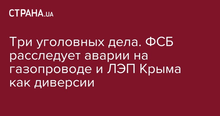 ФСБ возбудила три уголовных дела по факту недавних аварий на крымском газопроводе, из-за которого тысяча людей оставалась без топлива какое-то время, и обрушения ЛЭП. Эти аварии расследуются как диверсии, сообщают "РИА Новости".