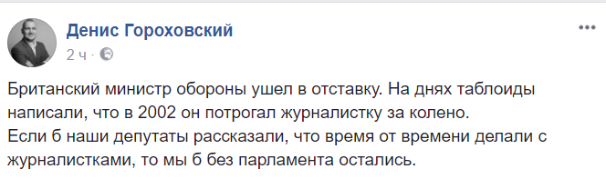 "Британский министр обороны ушел в отставку. На днях таблоиды написали, что в 2002 он потрогал журналистку за колено. Если б наши депутаты рассказали, что время от времени делали с журналистками, то мы б без парламента остались", - говорит журналист Денис Гороховский.