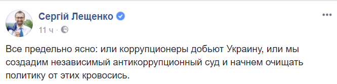 "Все предельно ясно: или коррупционеры добьют Украину, или мы создадим независимый антикоррупционный суд и начнем очищать политику от этих кровосись".